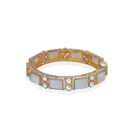 A stunning gold plated bangle made with natural Mother of Pearl stones inlaid with diamante and high quality polki stones