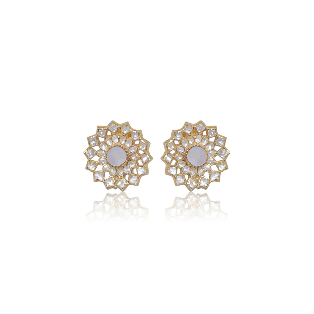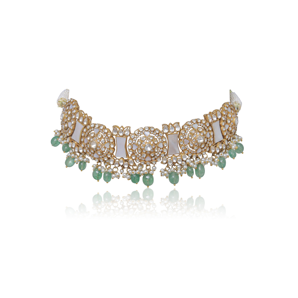 A statement choker made with high quality polki and natural mother of pearl stones embellished with pearls and natural green stone drops with matching stud style earrings