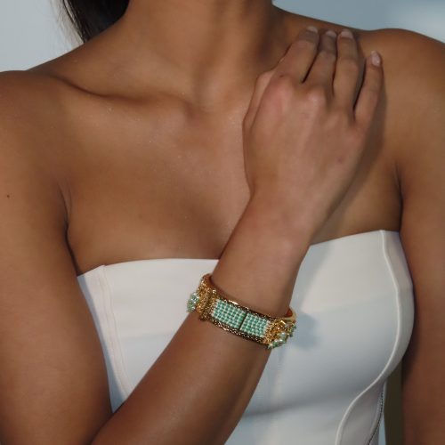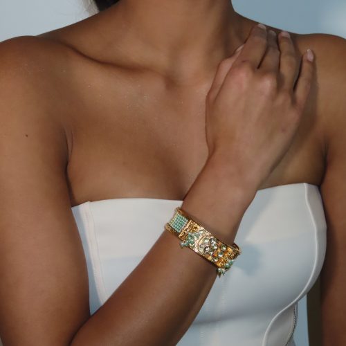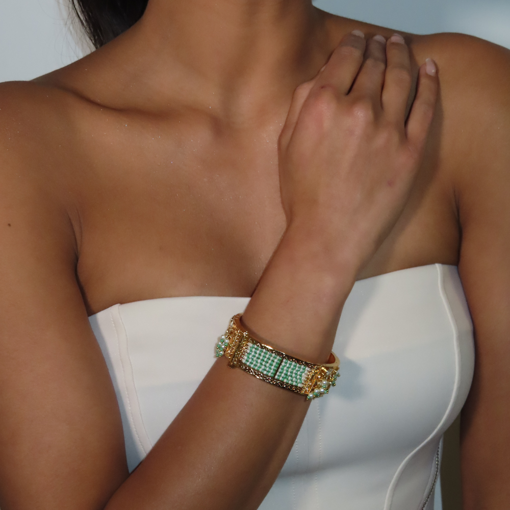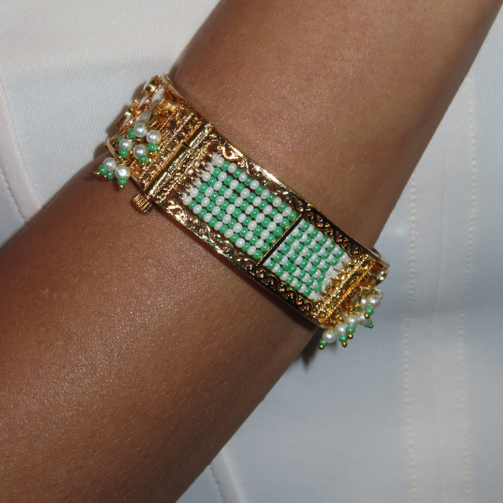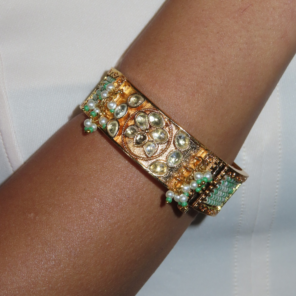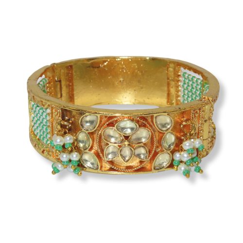 A gold toned bangle made with Kundan stones embellished with green beads and pearls