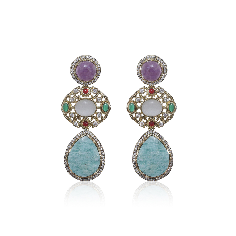 A beautifully handcrafted pair featuring a striking mix of soft and vibrant tones. These earrings showcase a lavender amethyst top stone, a luminous opal-white centre framed with crystals, and rich mint-green and coral red accent stones for a touch of colour.