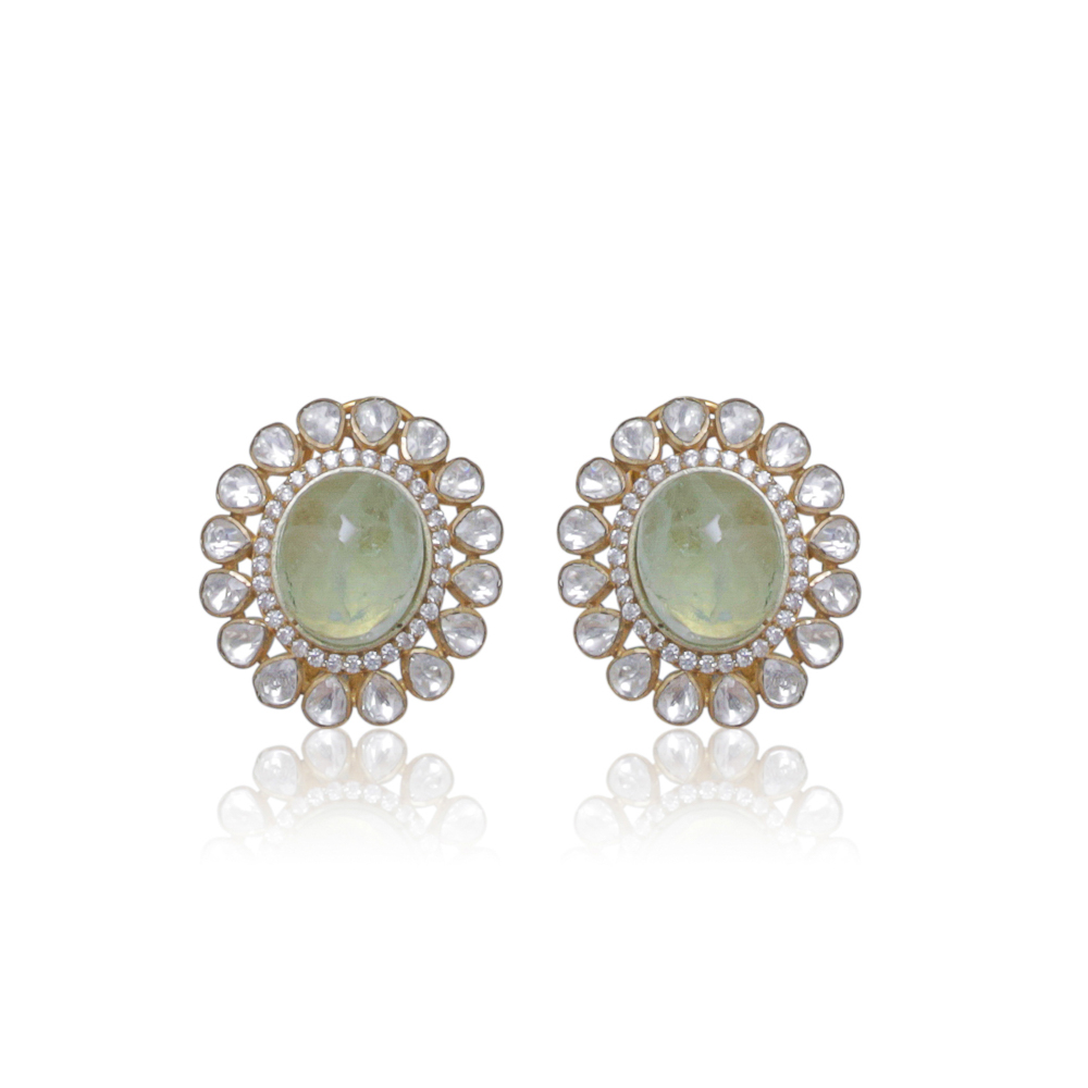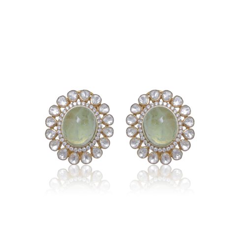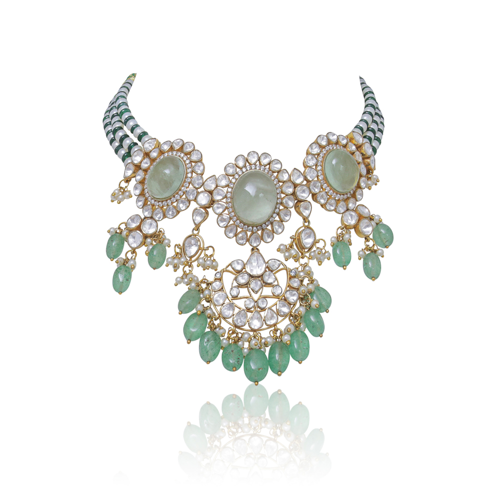 A gorgeous necklace made with natural sage green stones and high quality polki stones embellished with pearls and emerald green beads on the sides and finished off with natural green stone drops. It comes with matching stud-style earrings that can also be worn on their own – a perfect piece to elevate any look