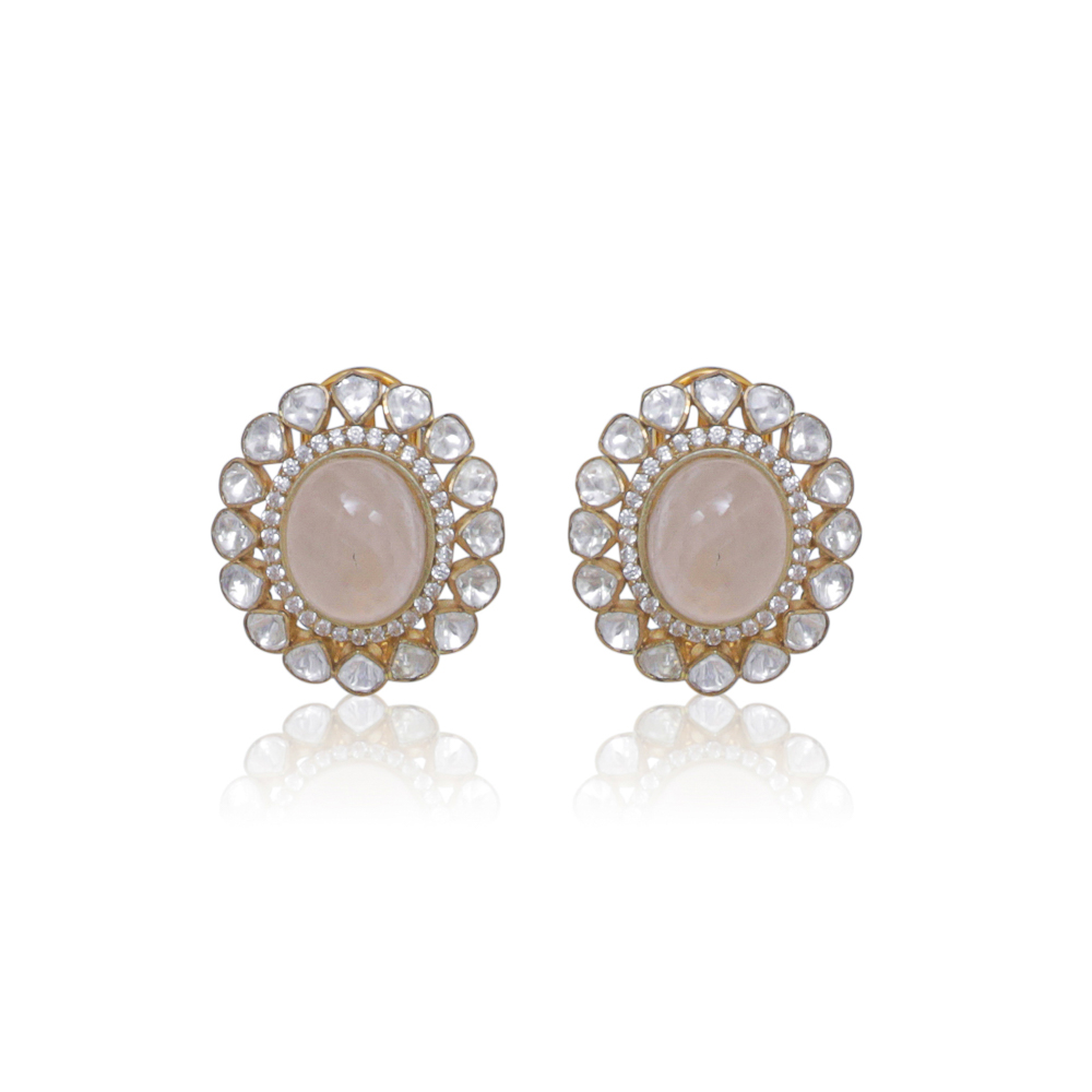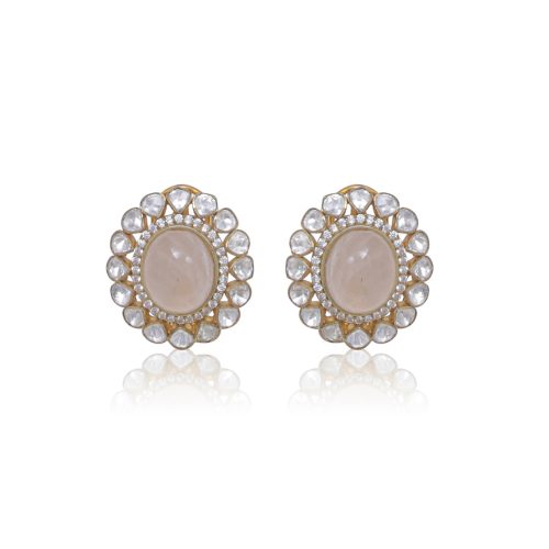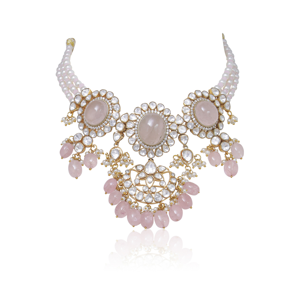 A gorgeous necklace made with natural pink stones and high quality polki stones embellished with pearls and pink beads on the sides and finished off with natural pink stone drops. It comes with matching  stud-style earrings that can also be worn on their own – a perfect piece to elevate any look