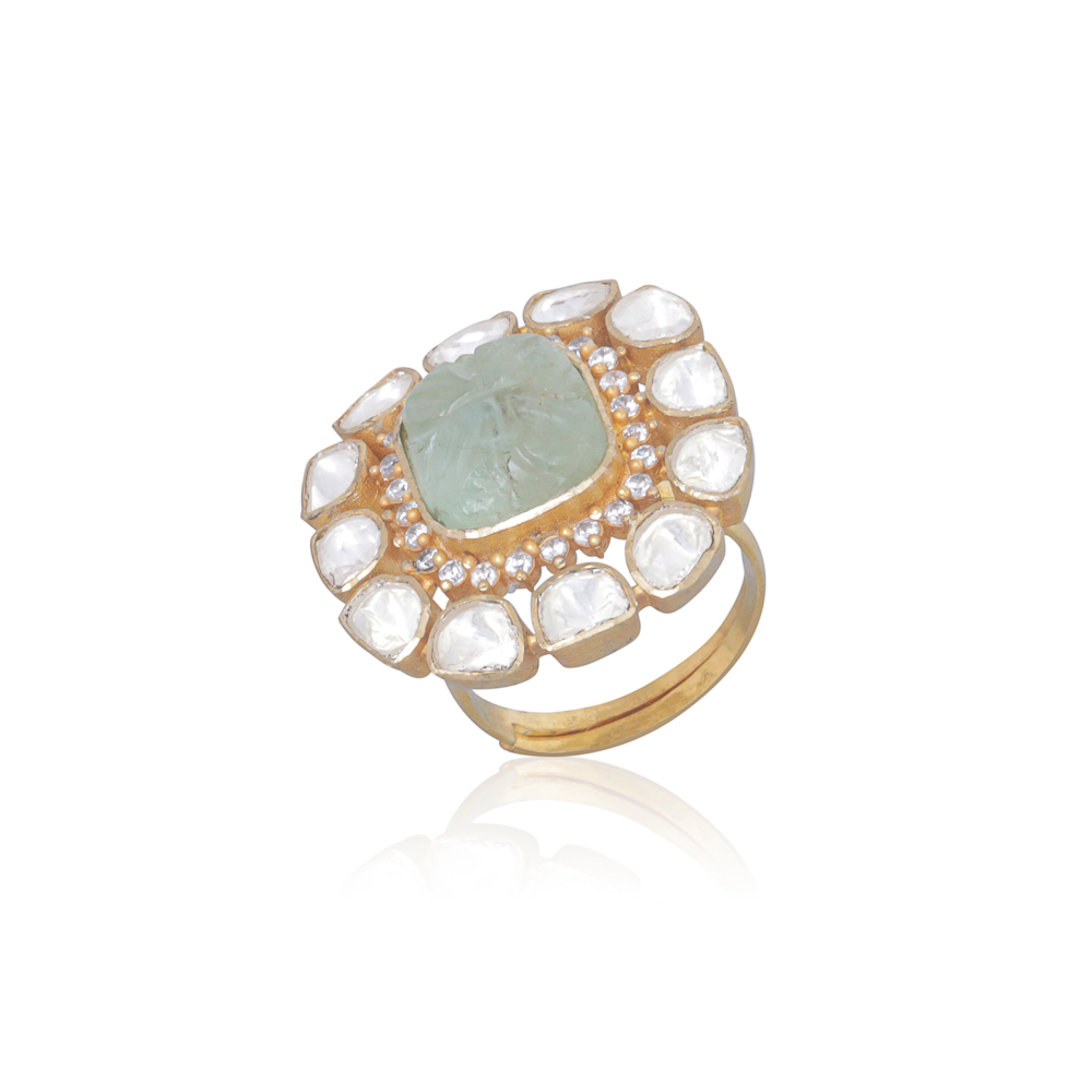 A gorgeous gold plated square ring made with high quality polki and natural sage green stones