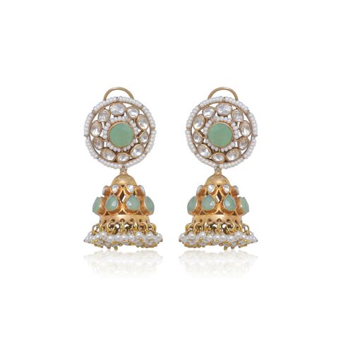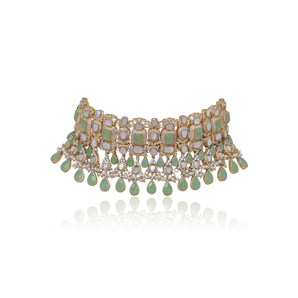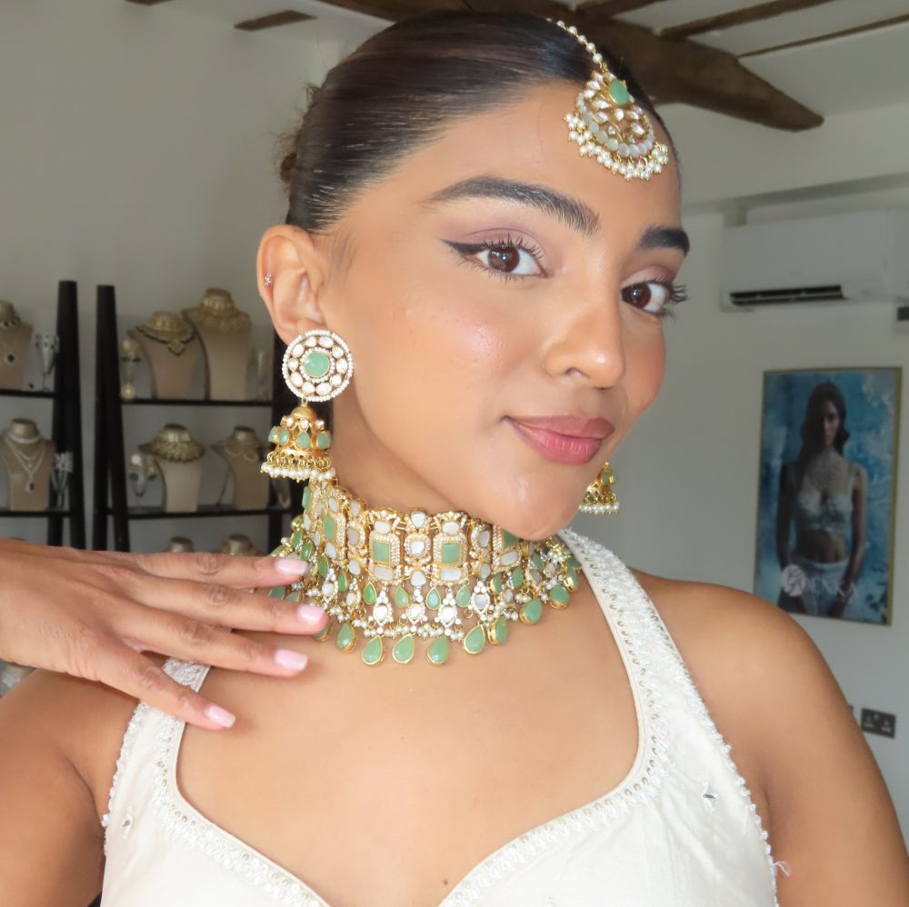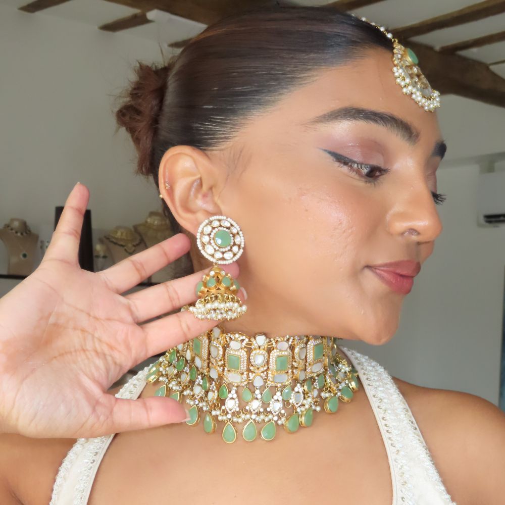 A beautiful gold plated choker made with light green stones inlaid with diamante and high quality polki stones with matching jhumka style earrings and a tikka/headpiece