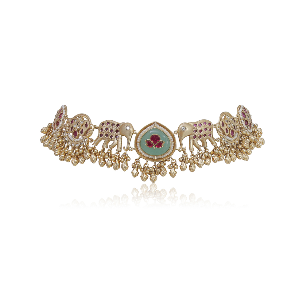 A beautifully handcrafted gold-finish choker featuring intricately carved elephants, accented with soft mint green stones and delicate pearl detailing. The design is further enhanced with stunning gold drops for a regal touch.