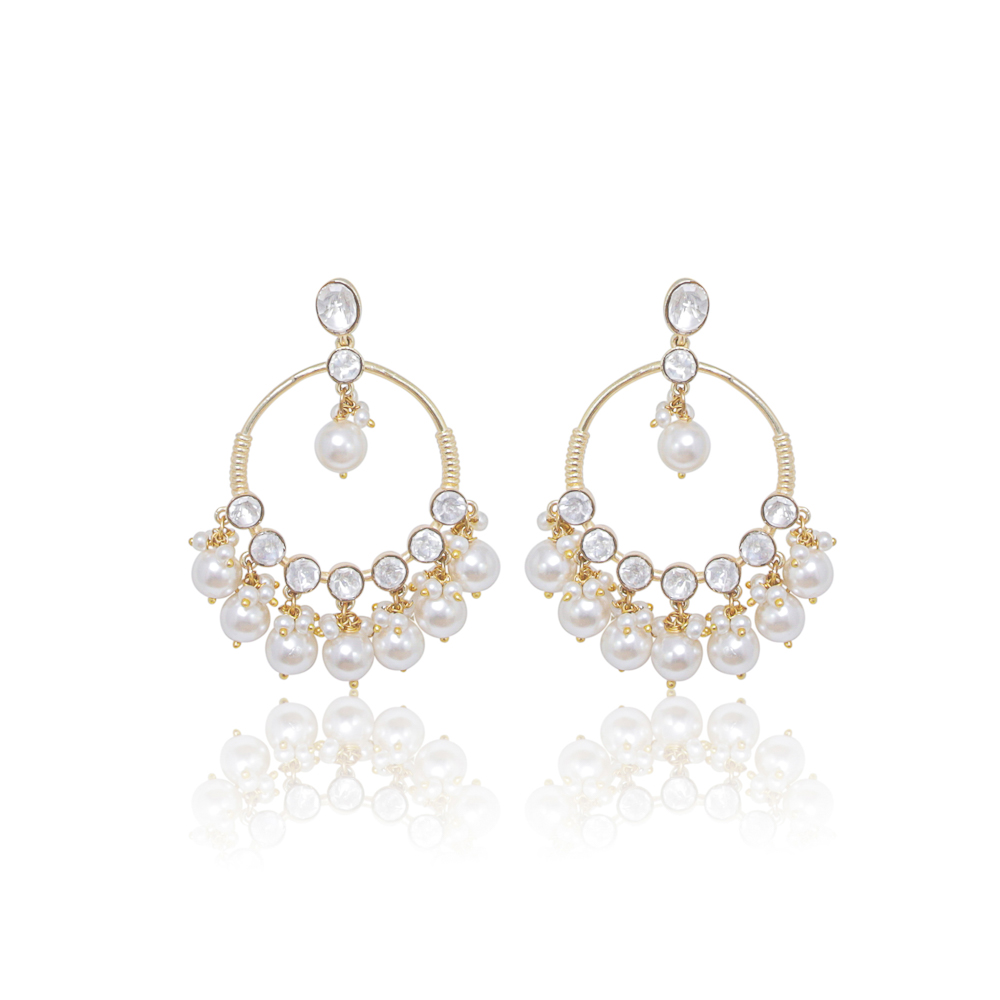 A pair of stunning gold plated hoop style earrings made with high quality polki stones and embellished with pearl drops