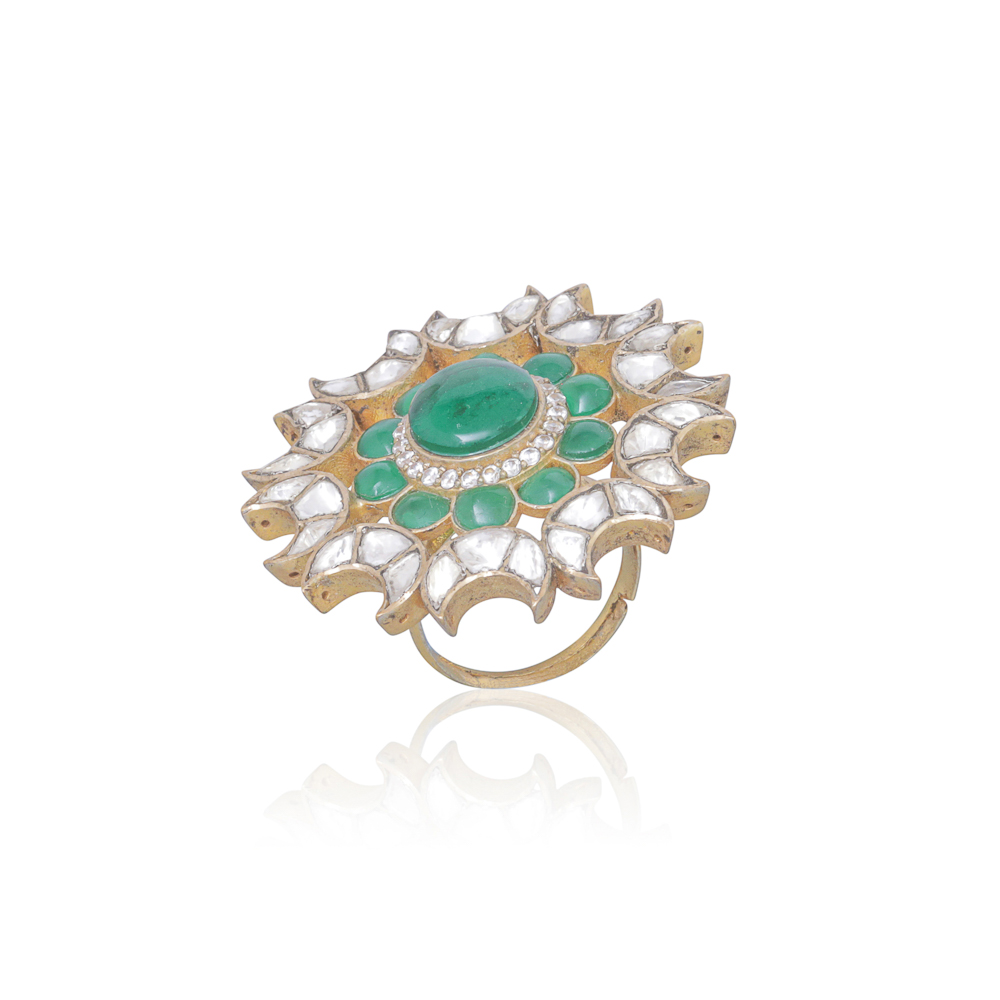 A gorgeous gold plated statement ring made with high quality polki and natural emerald green stones. Adjustable band (one size fits all)