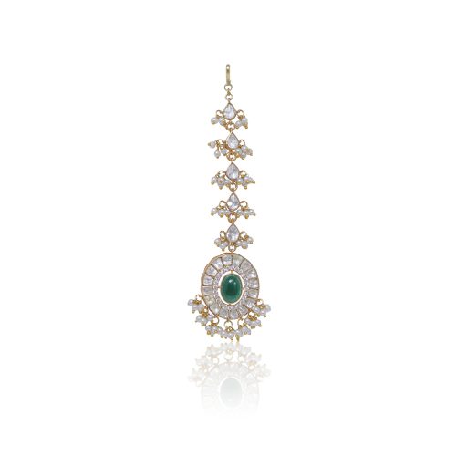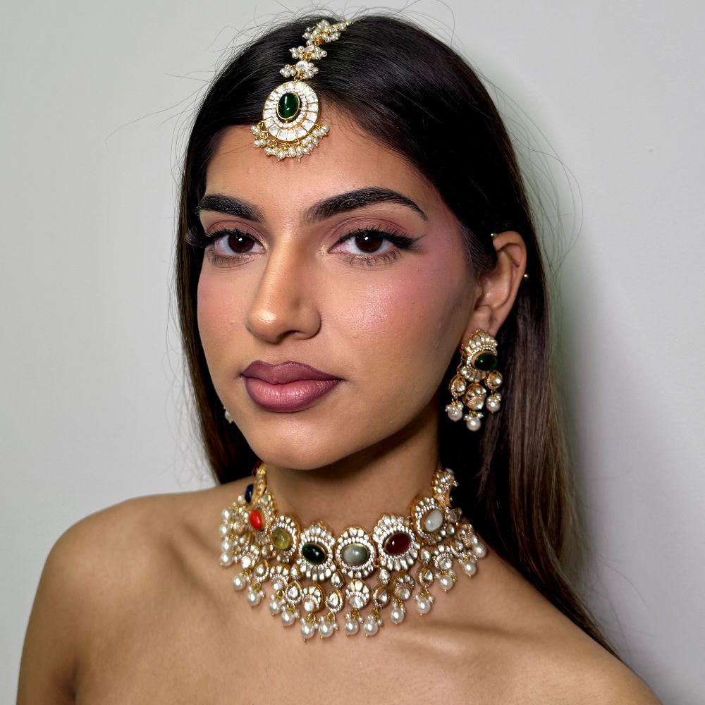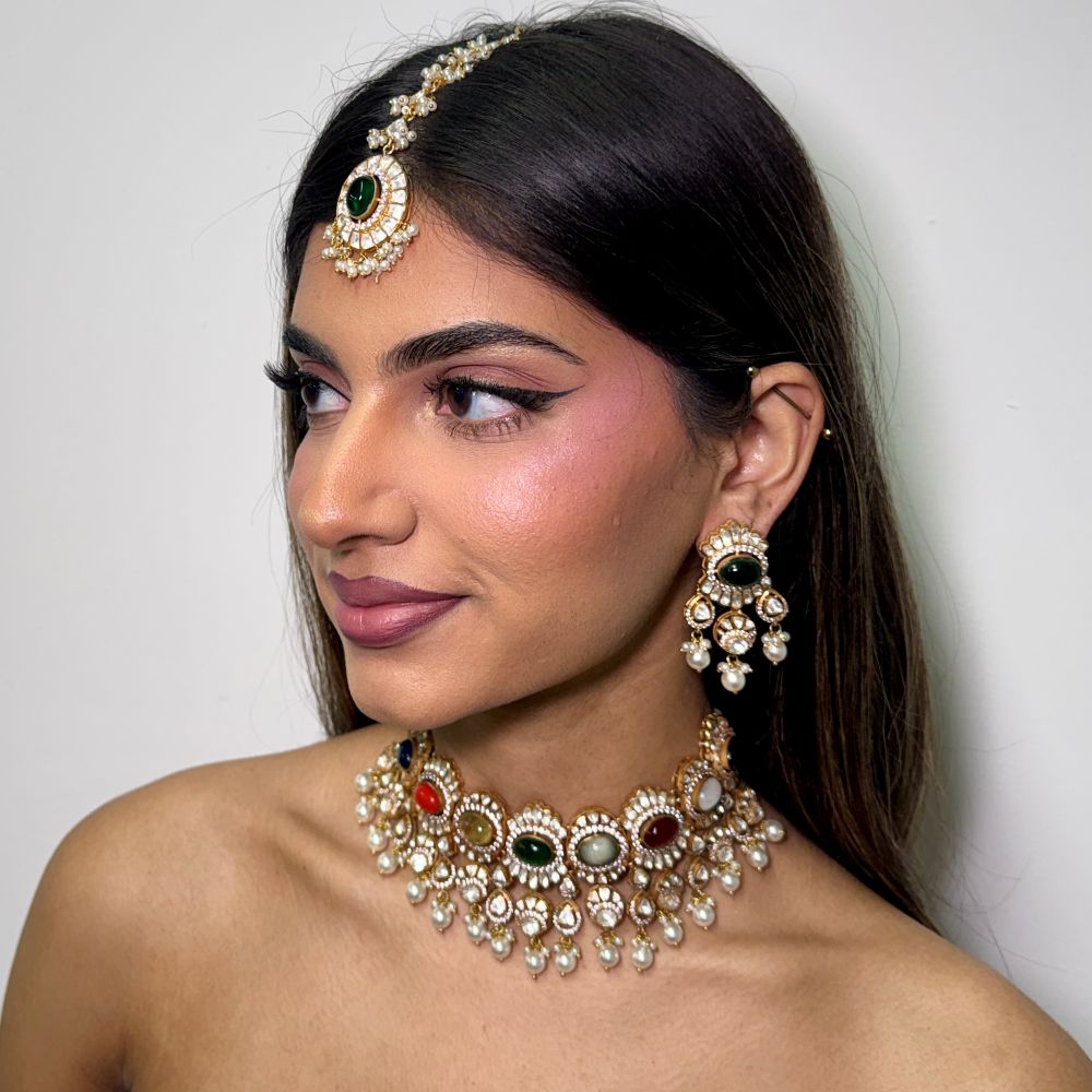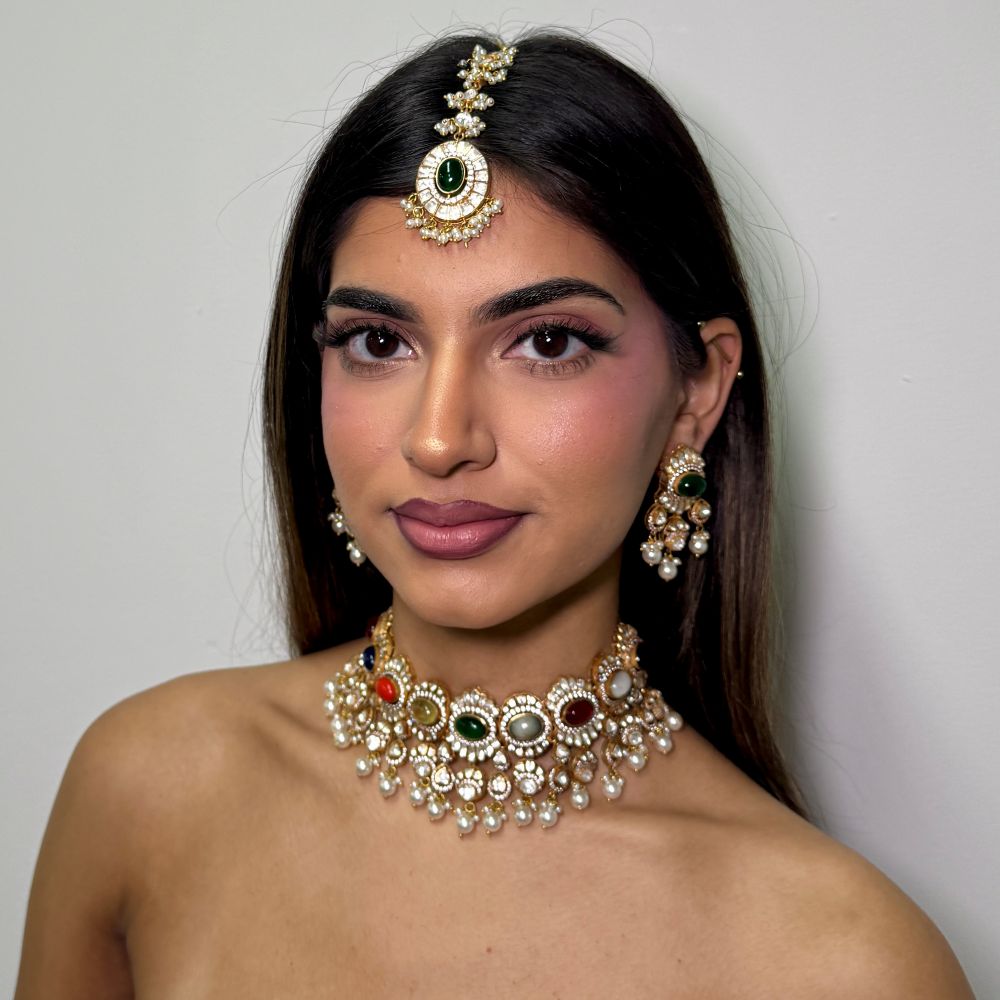 A beautiful gold plated navratan choker made with natural multi-coloured stones inlaid with diamante and high quality polki stones embellished with pearl drops with matching earrings and a tikka/headpiece