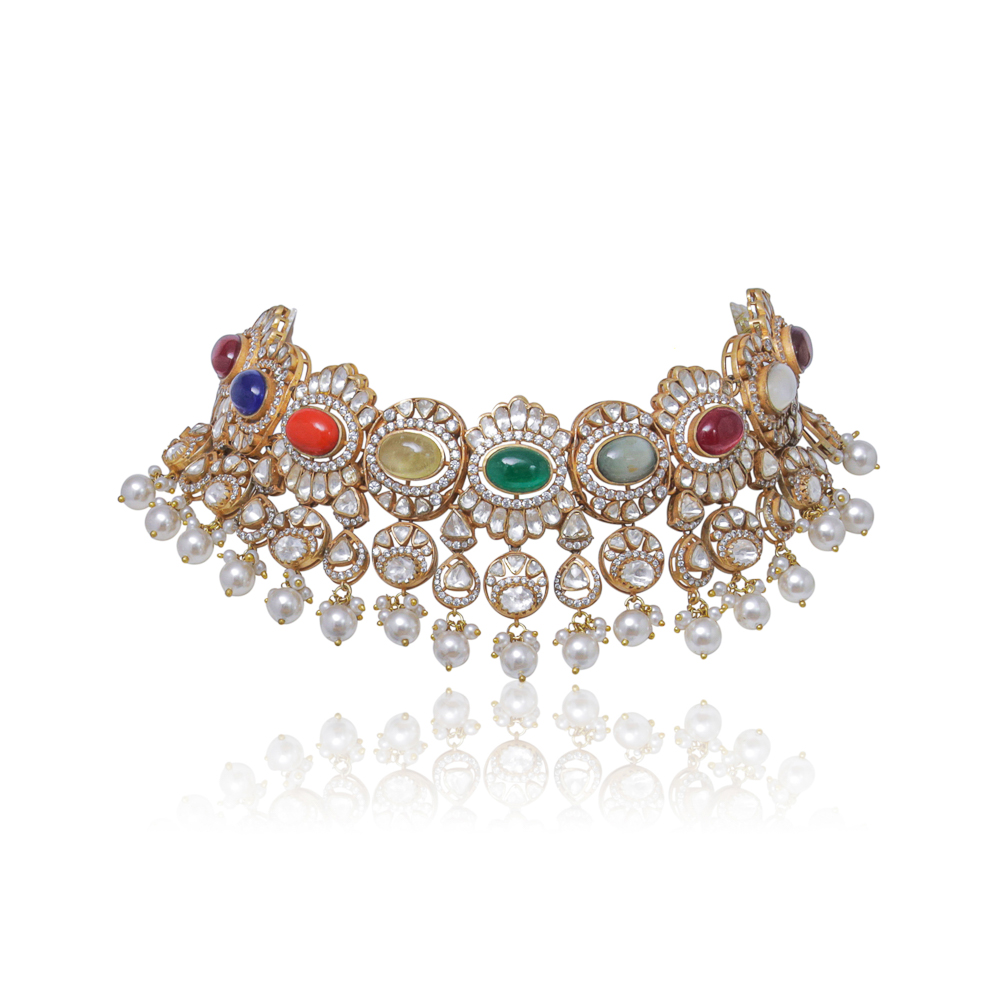 Gold plated navratan (multi-coloured) polki choker Set
