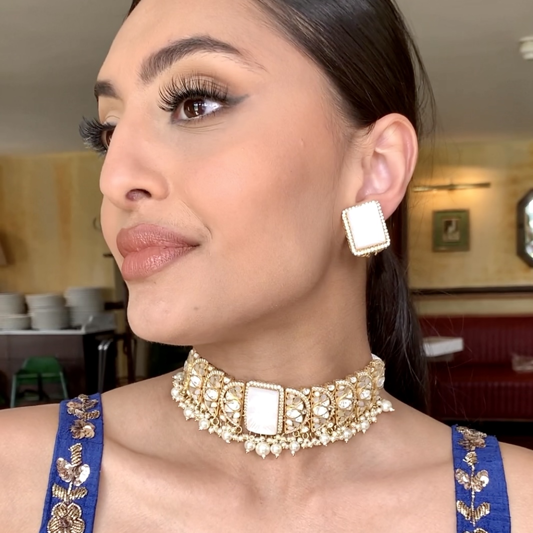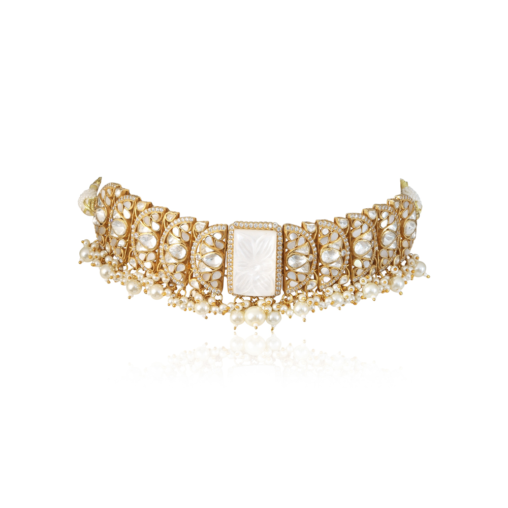 A gorgeous 925 sterling silver gold plated choker made with hand carved natural mother of pearl stones and high quality polki stones embellished with diamante and pearl drops with matching stud style earrings