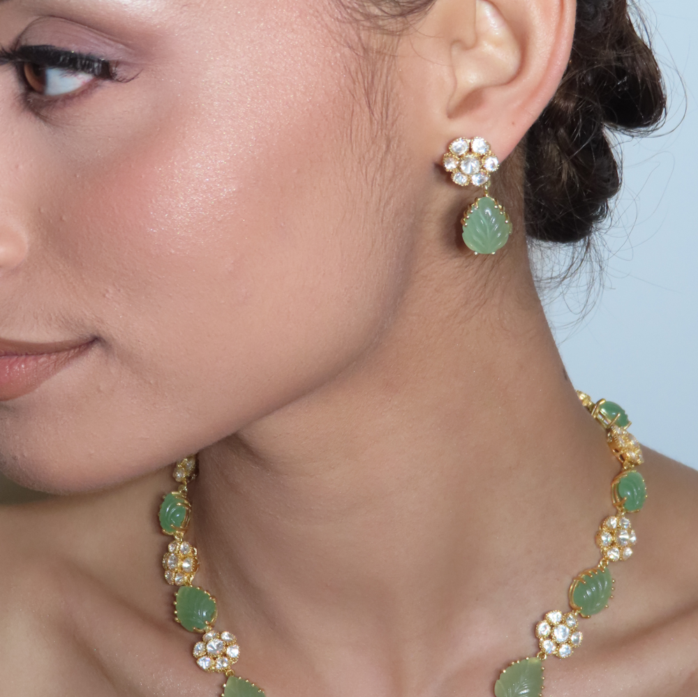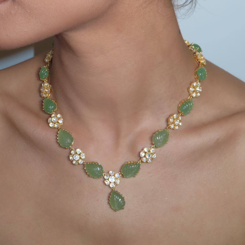 A beautiful 925 sterling silver gold plated necklace made with natural hand carved green stones and high quality mossianite stones inlaid with american diamonds with matching earrings