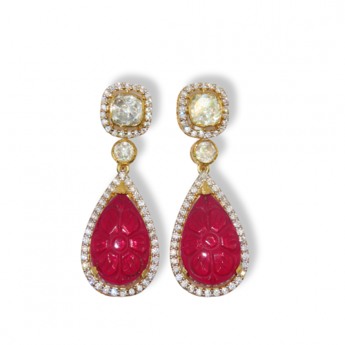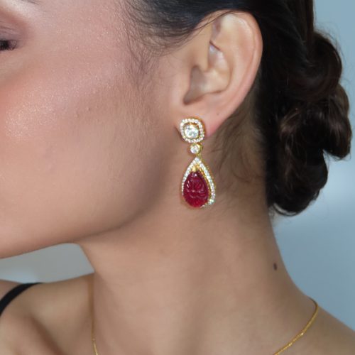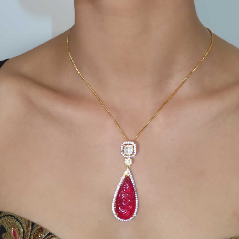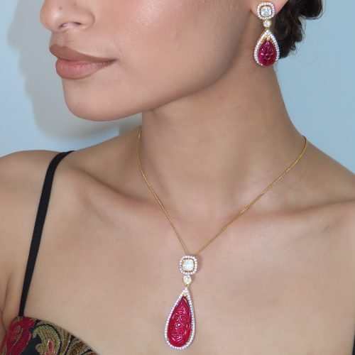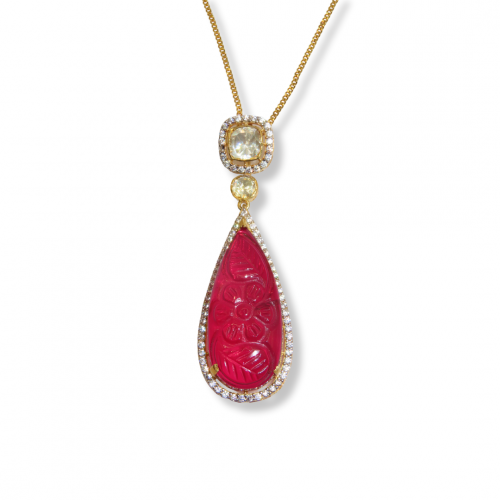 A beautiful 925 sterling silver gold plated pendant made with high quality moissanite and hand carved natural red stones in a 925 sterling silver gold plated chain with matching drop earrings