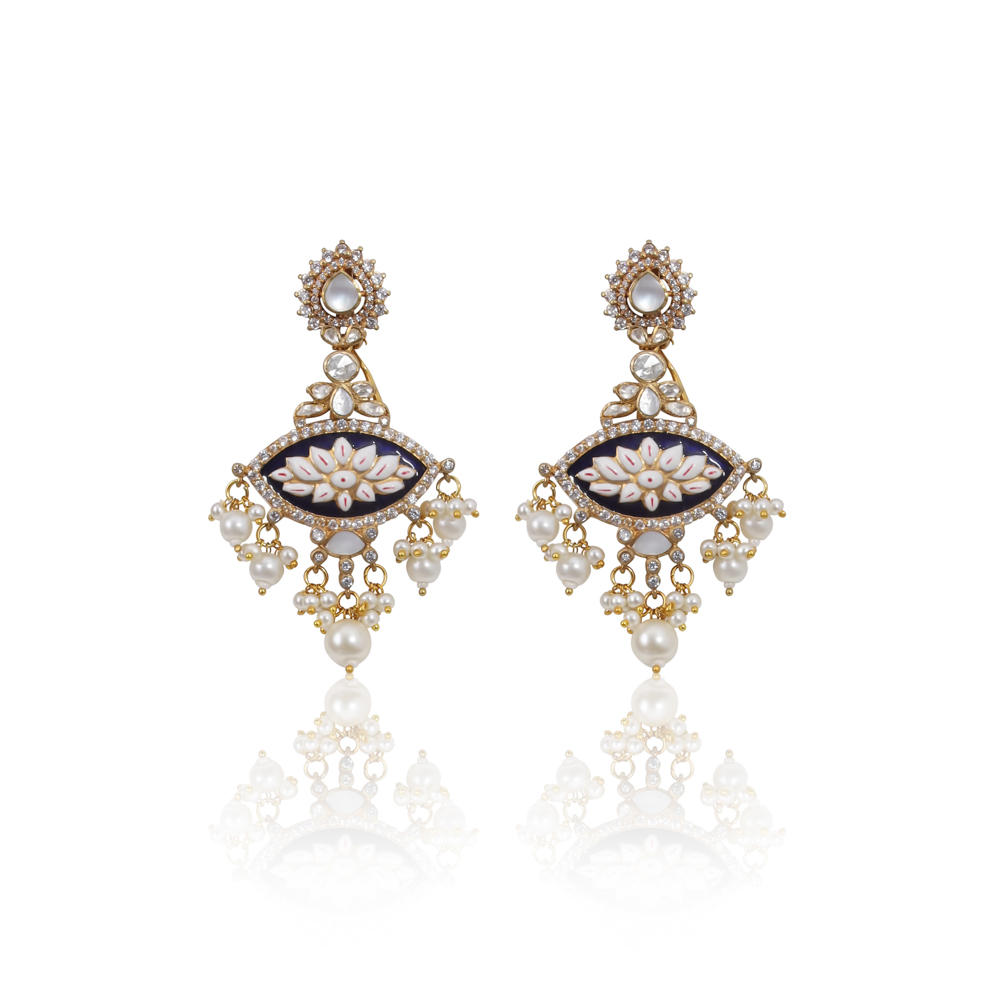 A beautiful pair of gold plated hand painted meenakari/enamel earrings featuring natural mother of pearl and high quality polki stones with pearl drops