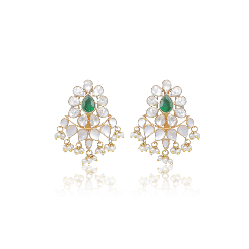 A beautiful gold plated choker made with natural emerald and high quality polki stones embellished with pearls with matching stud style earrings and a tikka/headpiece