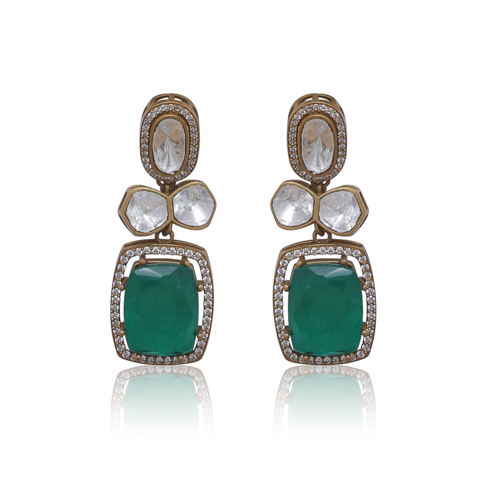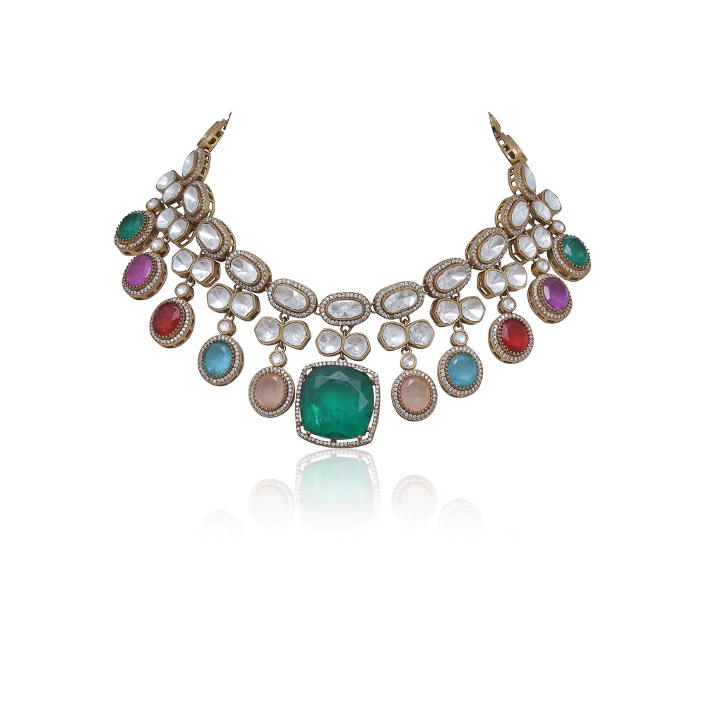 A stunning handcrafted statement necklace made with moissanite and multi-coloured stones inlaid with diamante with matching statement earrings