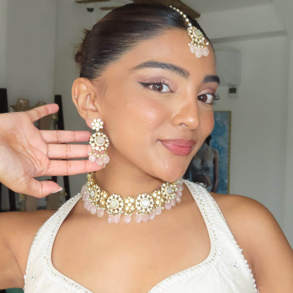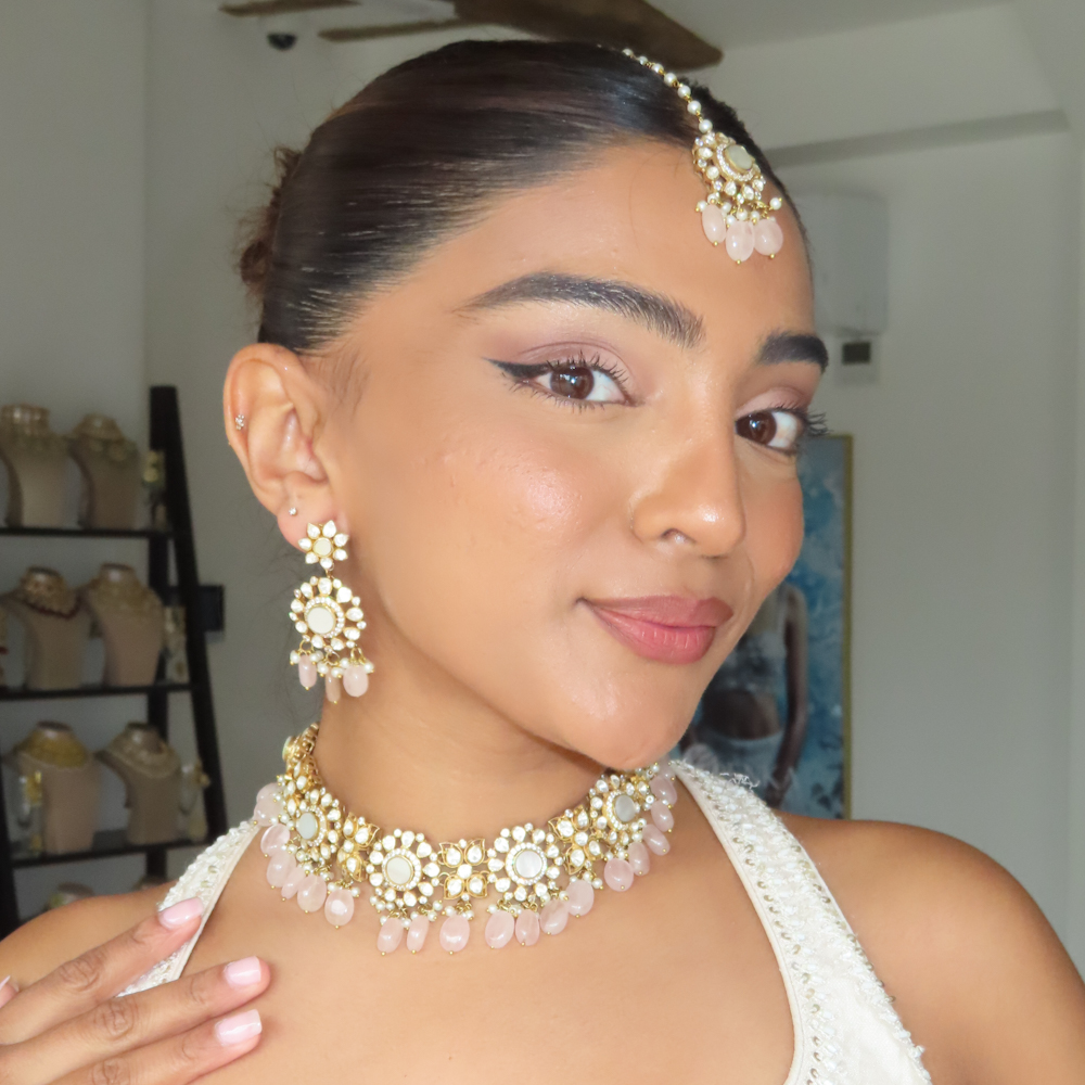 A beautiful 925 sterling silver gold plated necklace made with natural mother of pearl stones and high quality polki stones embellished with natural rose quartz drops with matching drop earrings and a tikka/headpiece