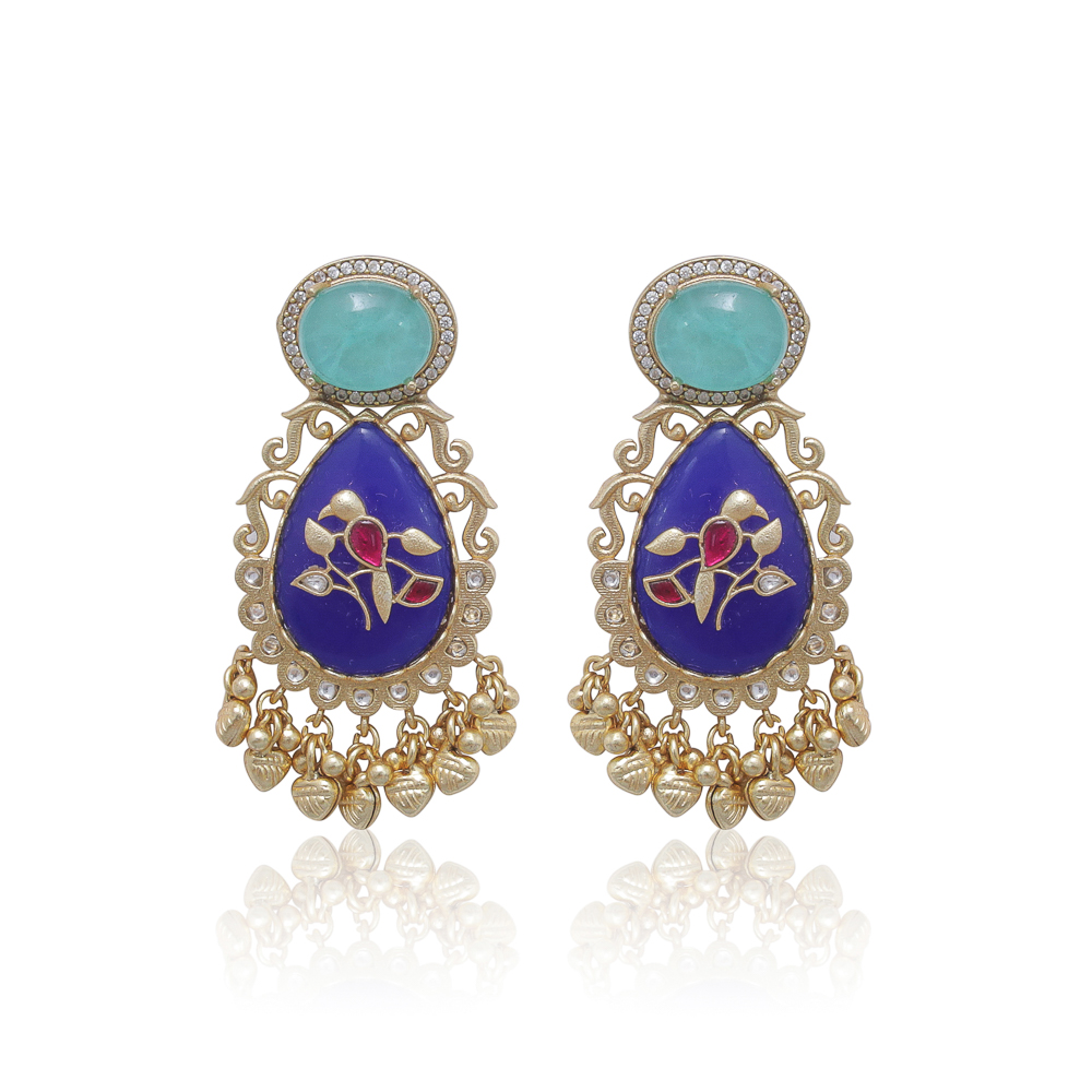 Beautifully handcrafted statement earrings featuring royal blue and aqua-mint stones, detailed with delicate enamel work and finished with stunning gold drops. A striking, feminine piece that adds effortless elegance to any occasion.