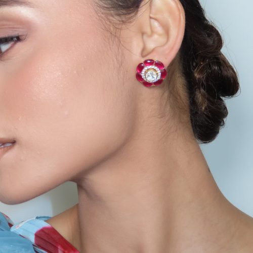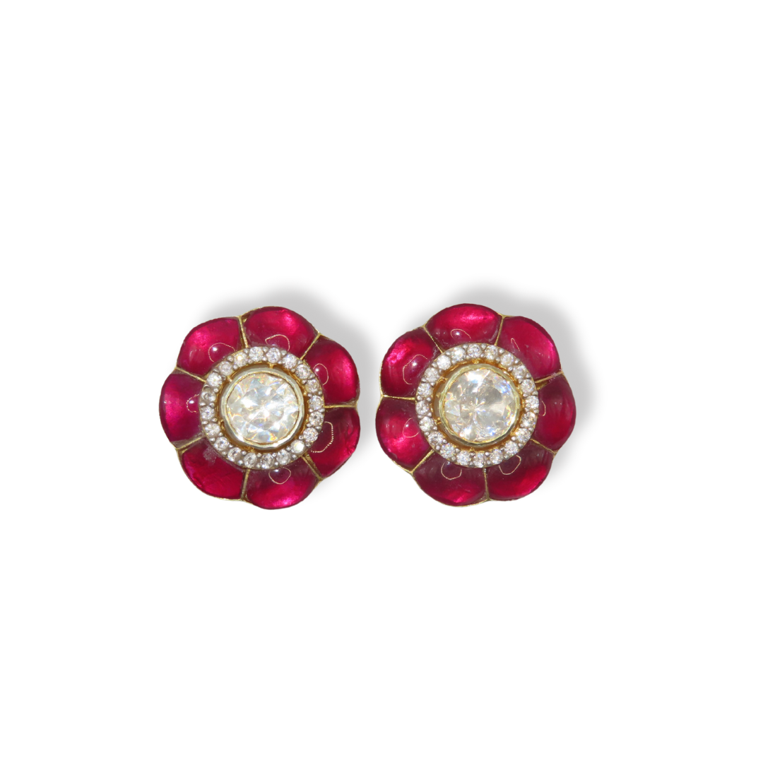 A gorgeous 925 sterling silver gold plated stud style earrings made with high quality moissanite and pink stones inlaid with american diamonds