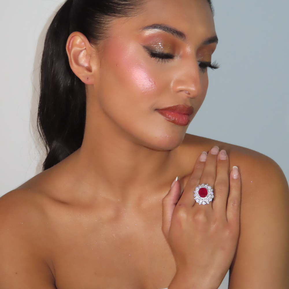 A stunning silver toned statement ring made with clear and ruby pink coloured Cubic Zirconia stones. It is adjustable so fits all sizes