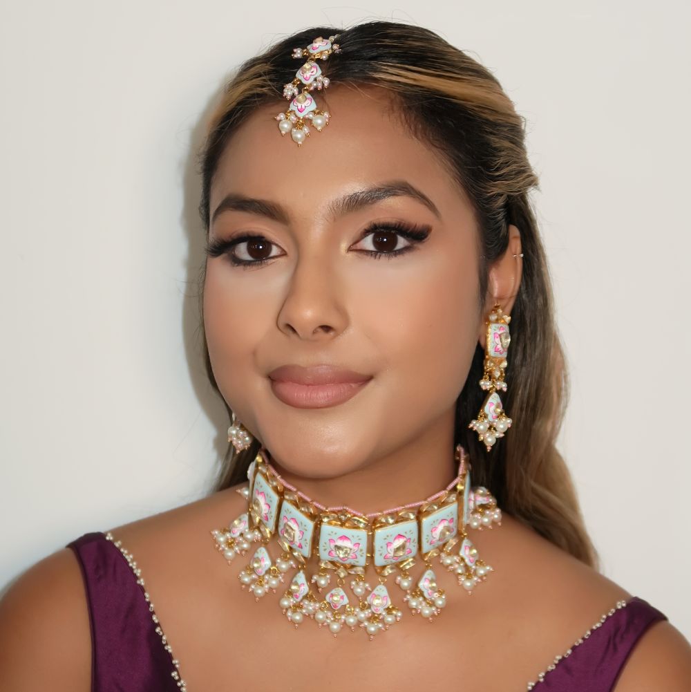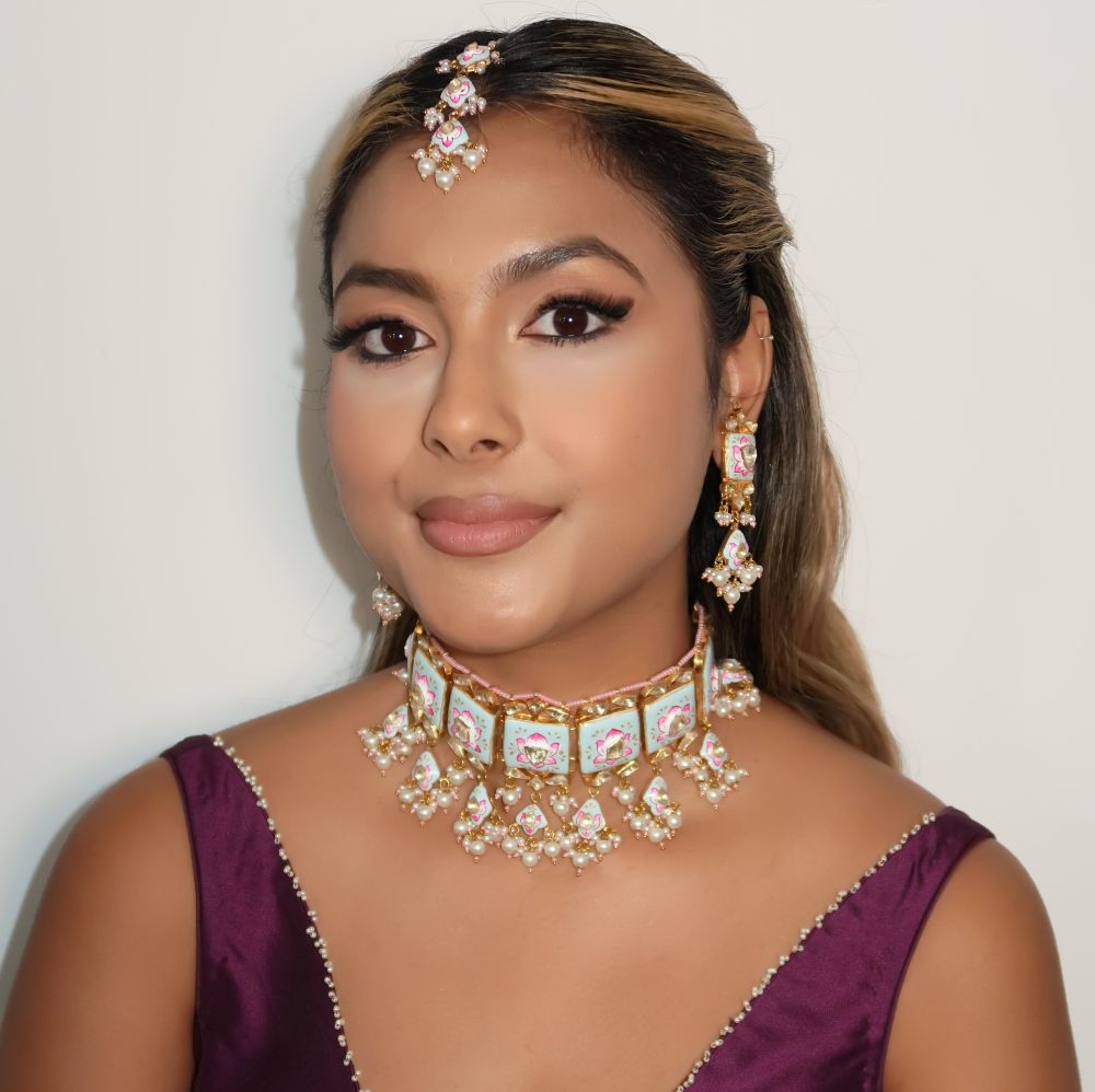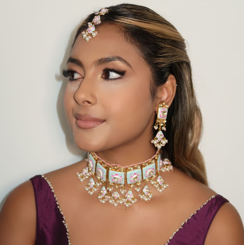 A gold toned statement choker made with Kundan stones featuring handpainted light blue and pink enamel/meenakari work embellished with pink beading and finished off with pearl drops with matching earrings and a tikka/headpiece