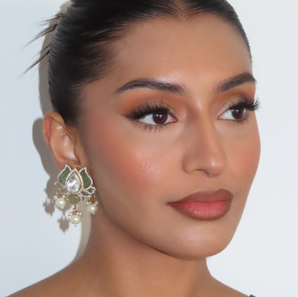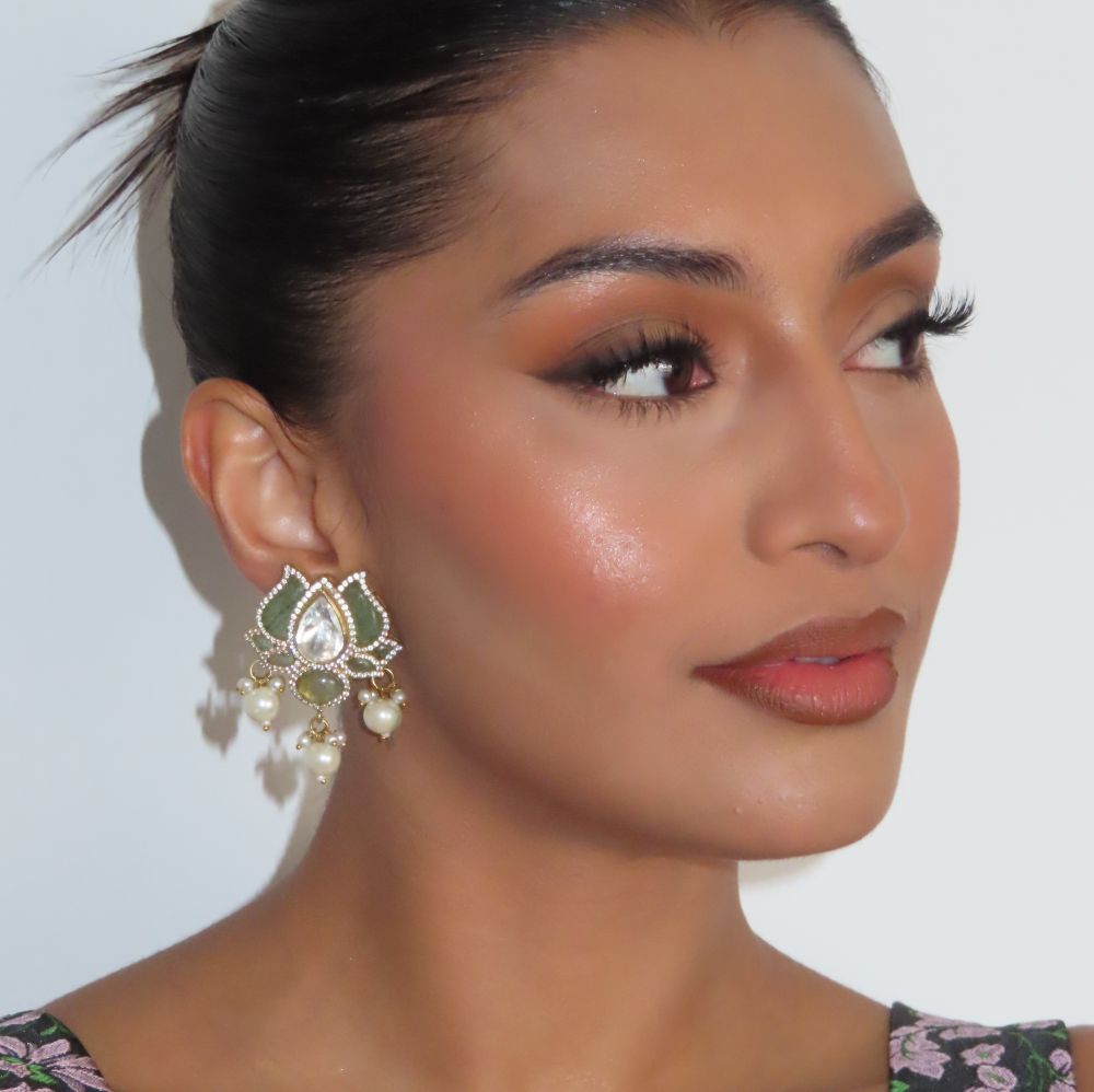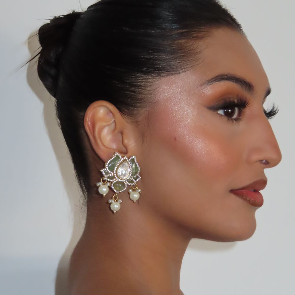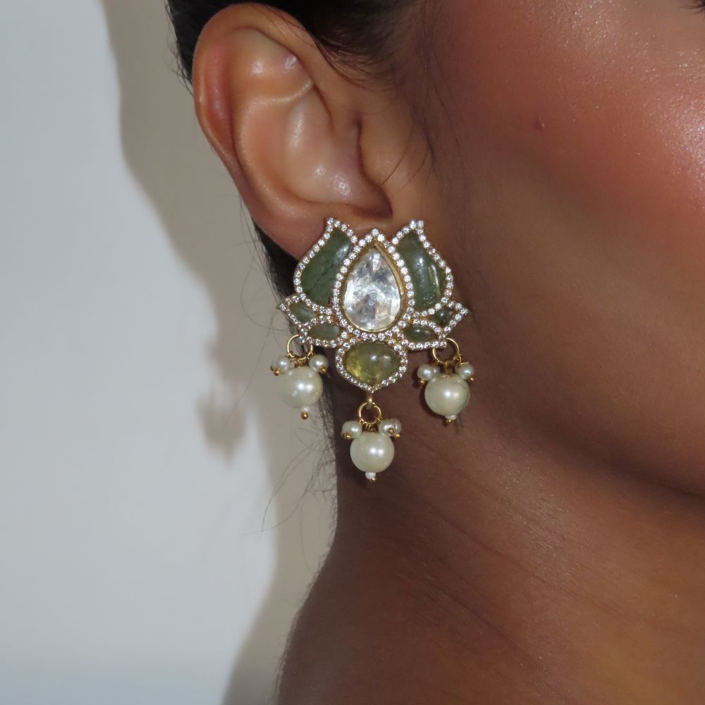 A gorgeous pair of 925 sterling silver gold plated lotus shaped statement earrings made with high quality moissanite and natural green stones embellished with pearl drops