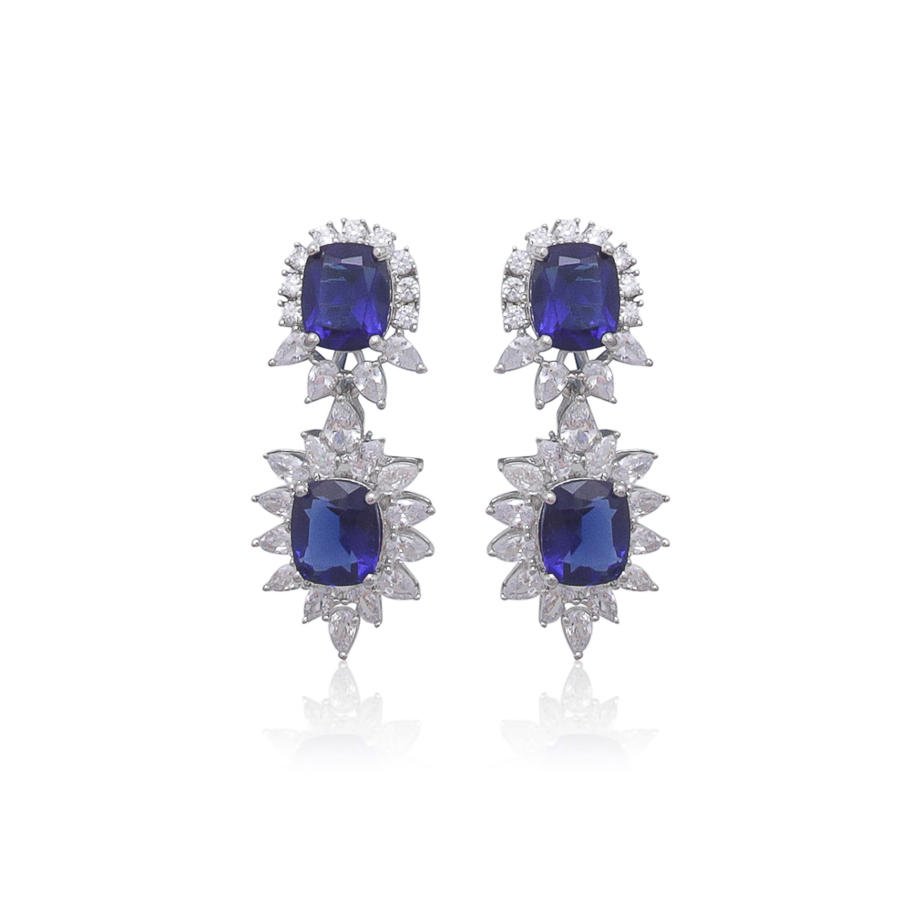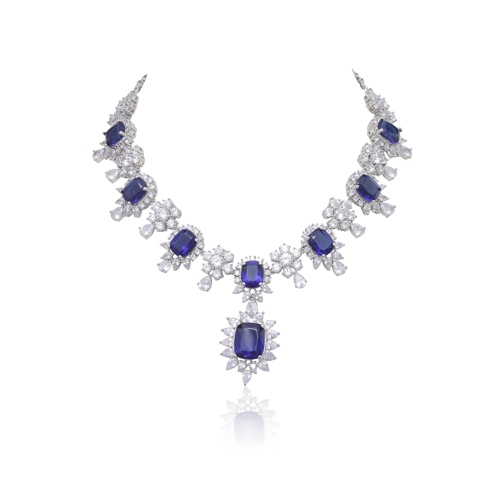 Silver toned Cubic Zirconia necklace with sapphire blue stones with matching drop earrings