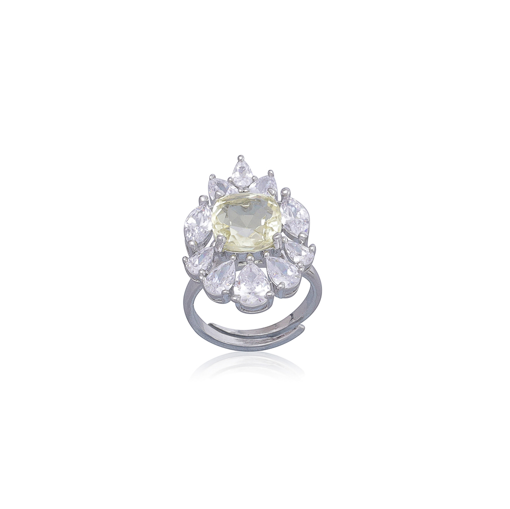 A stunning silver toned statement ring made with clear and yellow coloured Cubic Zirconia stones. It is adjustable so fits all sizes