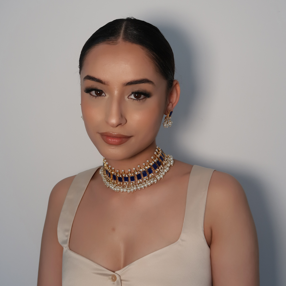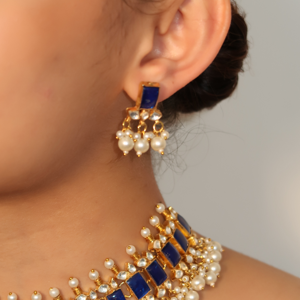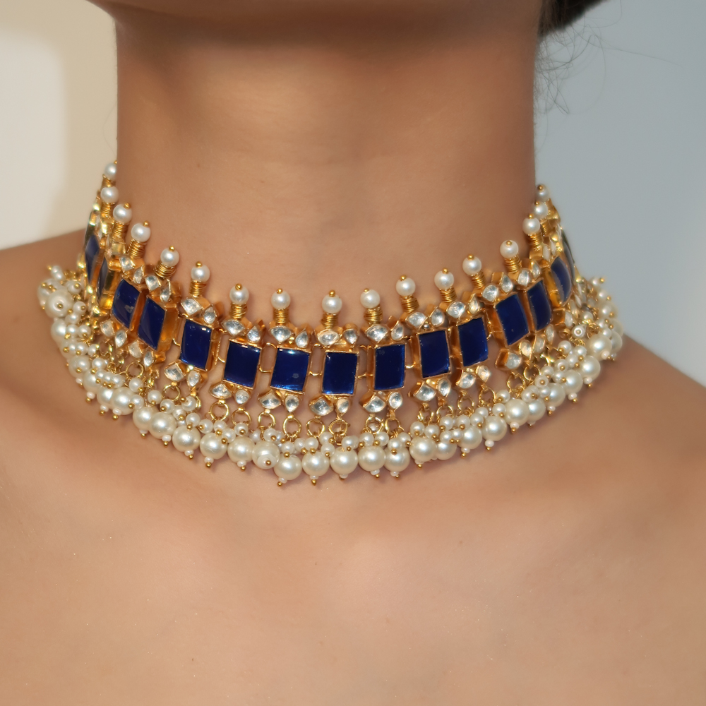 Beautifully handcrafted gold finish choker made with natural blue and Kundan stones embellished with pearl drops with matching small earrings