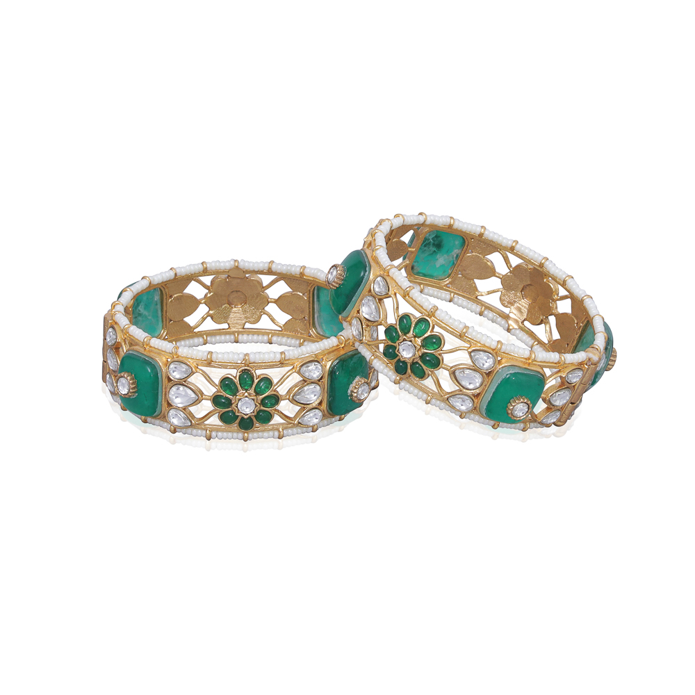 Beautifully handcrafted gold-plated bangles featuring striking emerald-green stones, embellished with kundan detailing and delicate white pearl beading. A timeless floral motif adds an elegant touch, making these perfect for bridal and occasion styling.