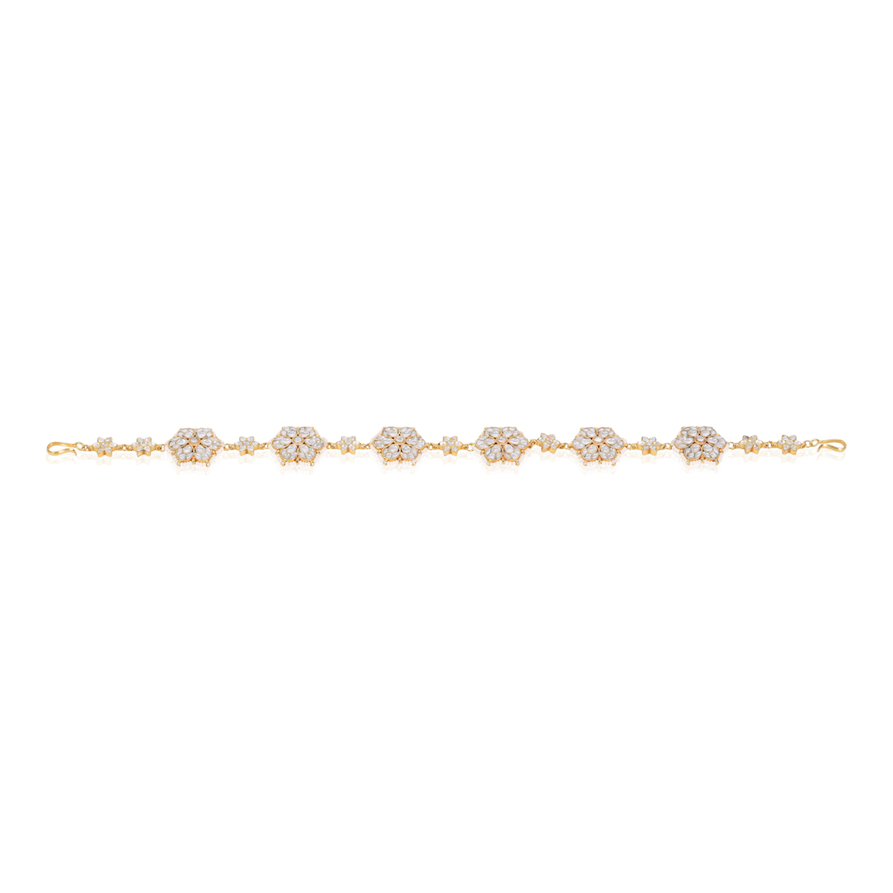 A gold toned headband made with Kundan stones with pearl detailing