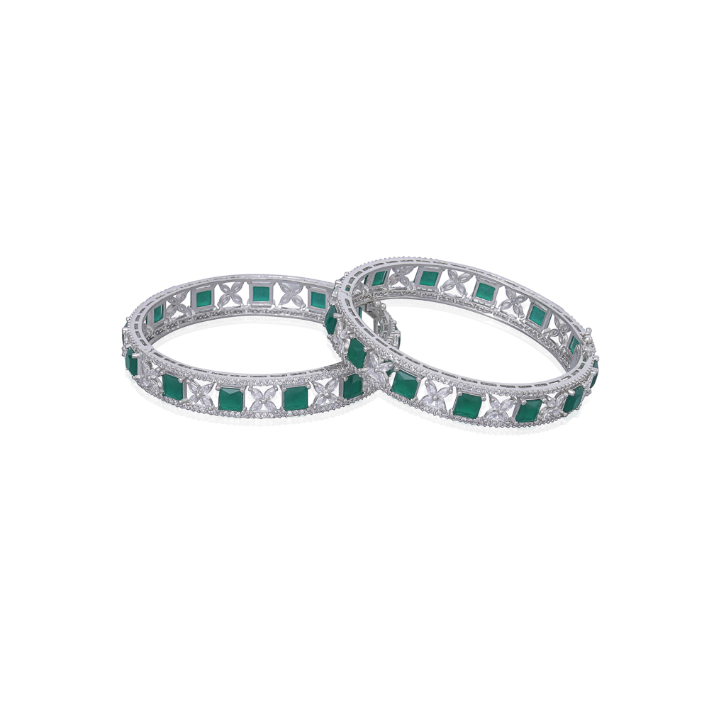 A pair of beautiful silver toned bangles made with clear and emerald green Cubic Zirconia stones