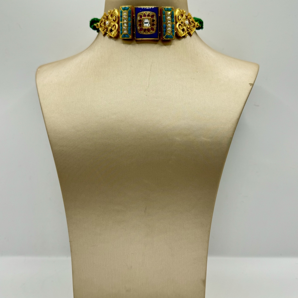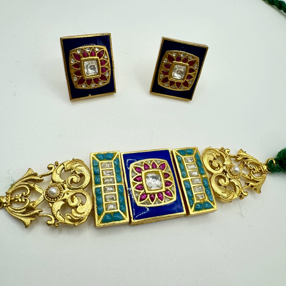 A beautiful gold finish choker made with high quality natural stones and moissanite stones with matching stud style earrings