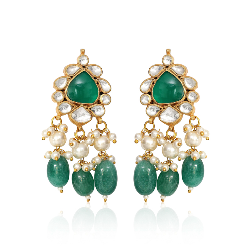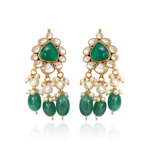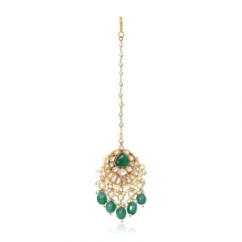 A gorgeous choker made with Kundan and emerald green stones embellished with pearl drops and emerald green stone drops with matching earrings and a tikka/headpiece