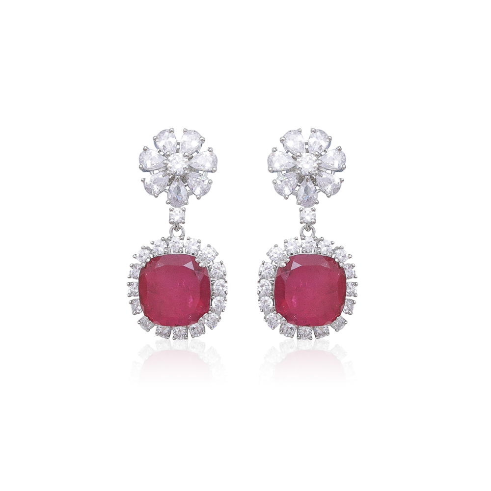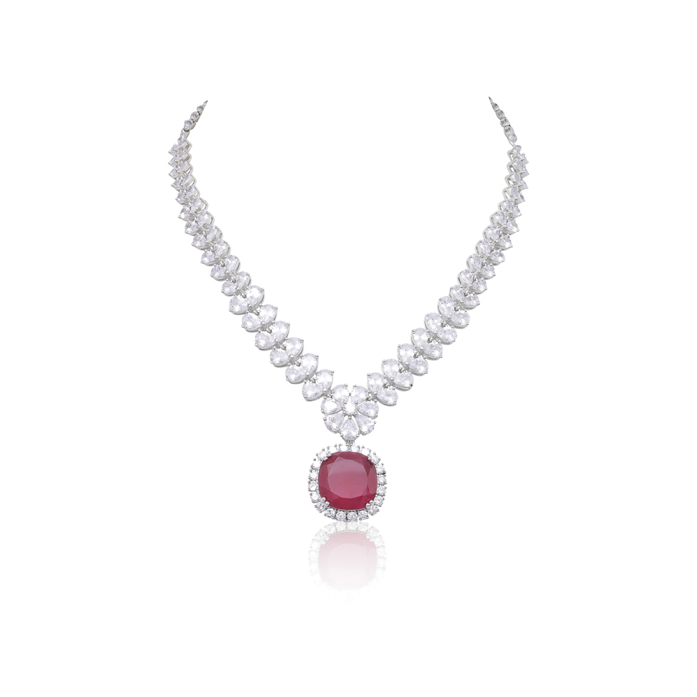 Silver toned Cubic Zirconia necklace with ruby stones with matching drop earrings