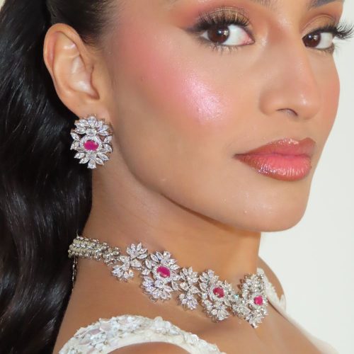 A silver toned necklace set made with Cubic Zirconia ruby coloured stones  with matching elegant stud style earrings