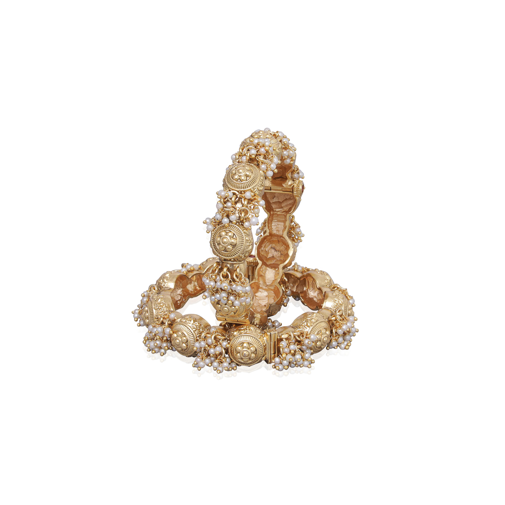 Statement gold-plated bangles decorated with ornate floral motifs and clusters of tiny pearls. Rich, traditional and beautifully detailed – an ideal choice for a bold bridal stack.
