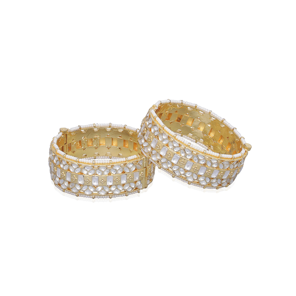 Handcrafted gold-plated bangles featuring checkered kundan work enhanced with pearl beading. A luxurious and balanced design that adds graceful sparkle to any celebration look.